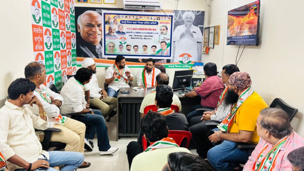 वसई–विरार शहर मनपा चुनावों को ध्यान में रखते हुए कांग्रेस ने संगठन को मजबूत बनाने के उद्देश्य से एक महत्वपूर्ण बैठक आयोजित की। कांग्रेस के प्रदेश सचिव और नालासोपारा विधानसभा प्रभारी कैप्टन सत्यम ठाकुर की अध्यक्षता में विरार ए और सी प्रभाग समितियों और नालासोपारा में बैठकें संपन्न हुईं। बैठक में चुनावी तैयारियों को गति देने और हर बूथ स्तर तक संगठन को सशक्त करने पर विशेष जोर दिया गया।
