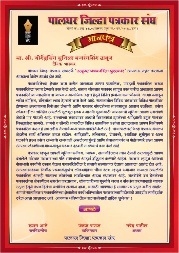 पालघर ; पत्रकारिता दिवस के अवसर पर सकारात्मक और संवेदनशील पत्रकारिता के क्षेत्र में उल्लेखनीय योगदान के लिए दैनिक भास्कर के लोकप्रिय कॉलम ‘मंडे पॉजिटिव’ को पालघर जिला पत्रकार संघ की ओर से वर्ष 2025 का उत्कृष्ट पत्रकारिता पुरस्कार प्रदान किया गया। यह सम्मान वरिष्ठ पत्रकार योगेंद्र सिंह ठाकुर को दिया गया।